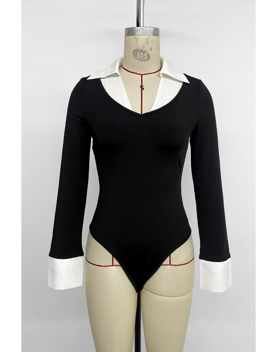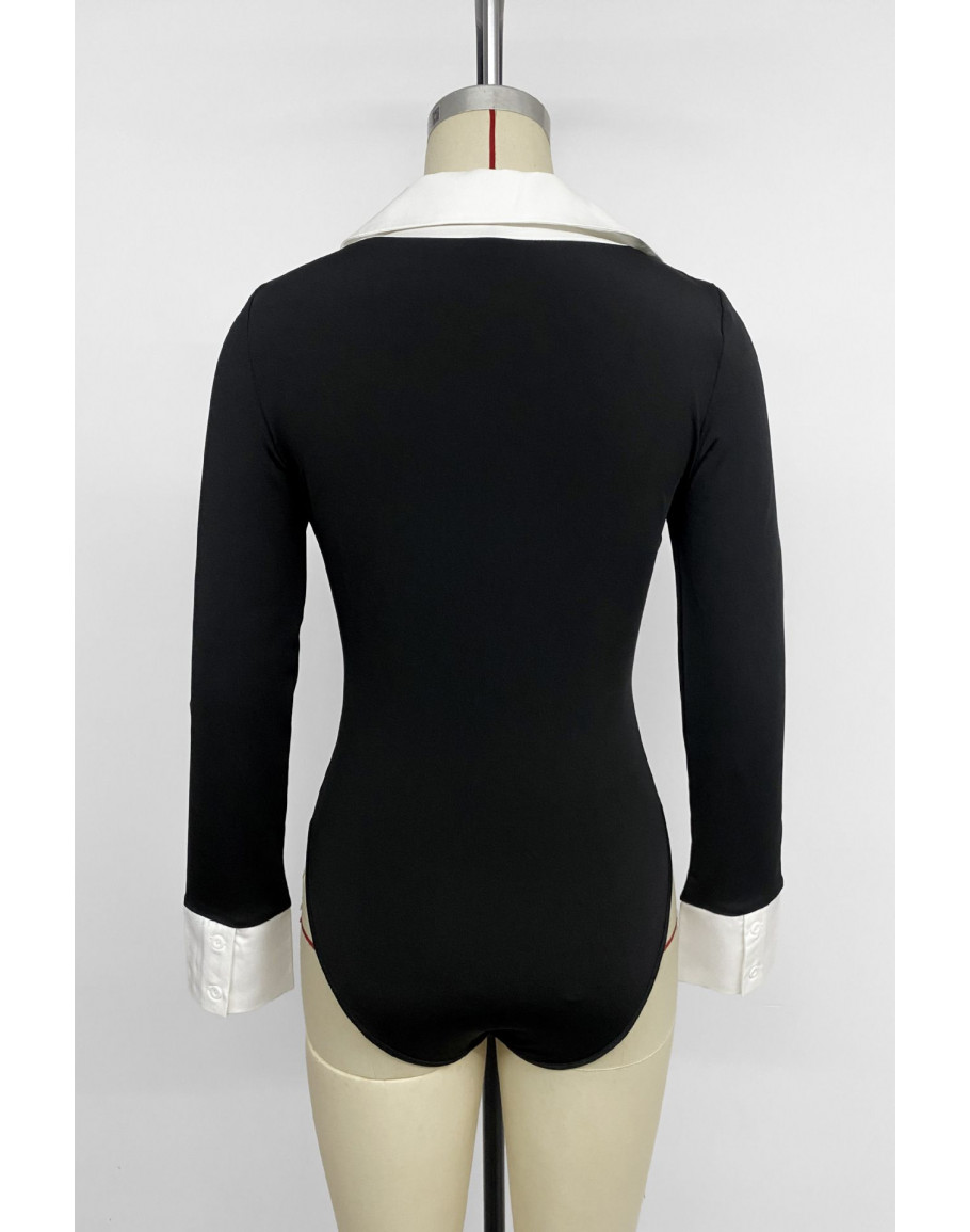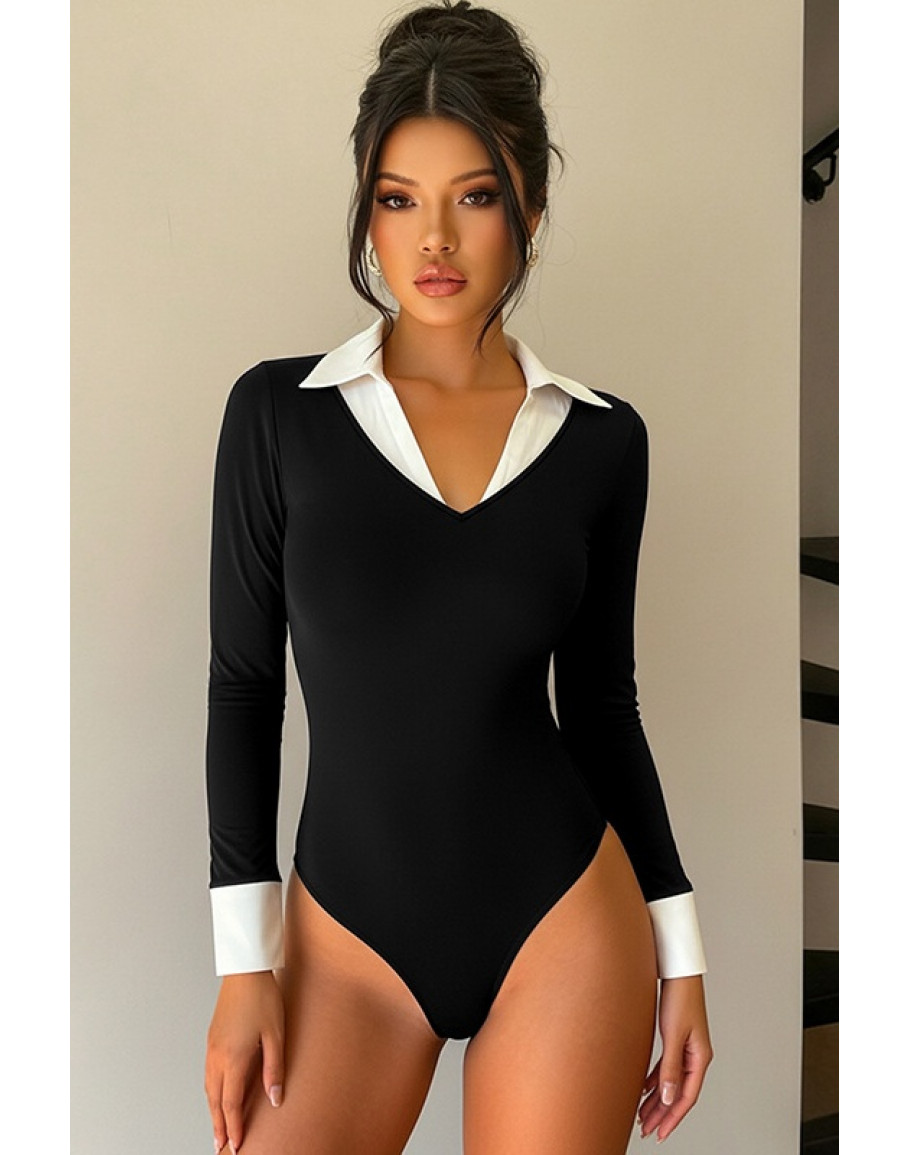 From desk to dinner, this structured collar bodysuit keeps your look sharp all day. A sleek long sleeve silhouette with tailored contrast details that transitions effortlessly into night plans.