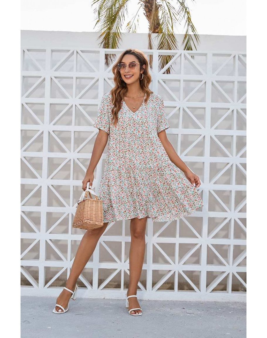 Take it from brunch to boardwalk with an easy tiered mini dress and v-neck finish. Add sandals and a straw bag for vacation summer day plans.