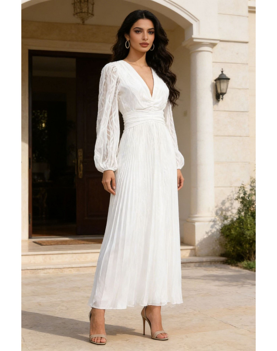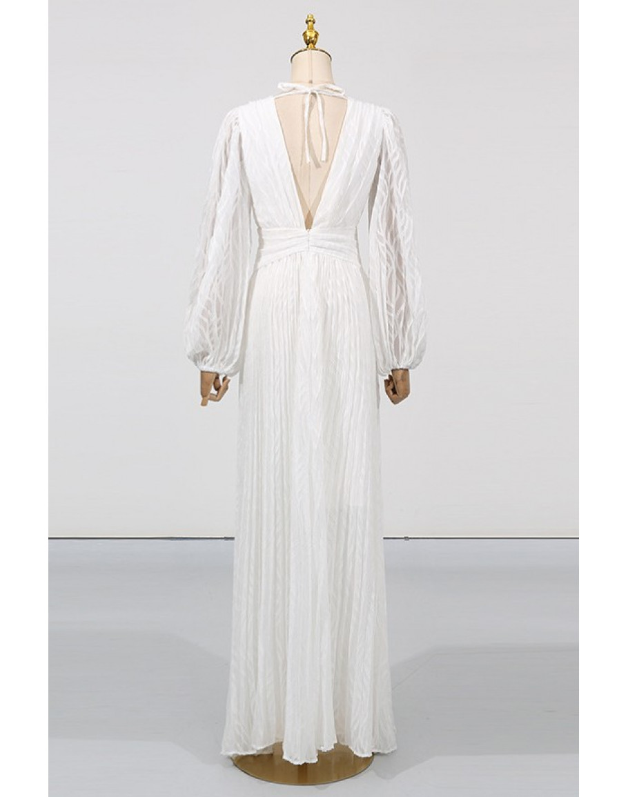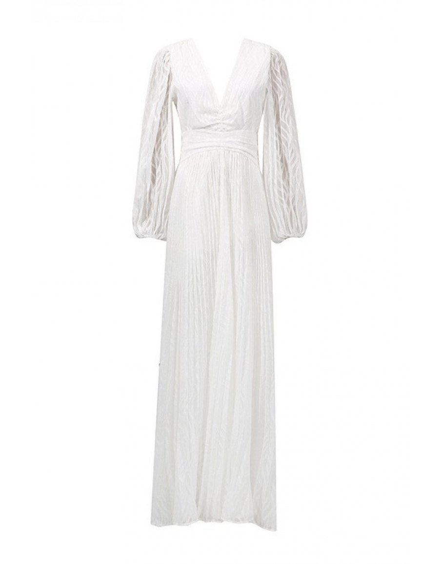 A flowing empire waist maxi dress with a deep plunge neckline and sheer sleeves. A striking choice for white party events and elegant celebration nights.