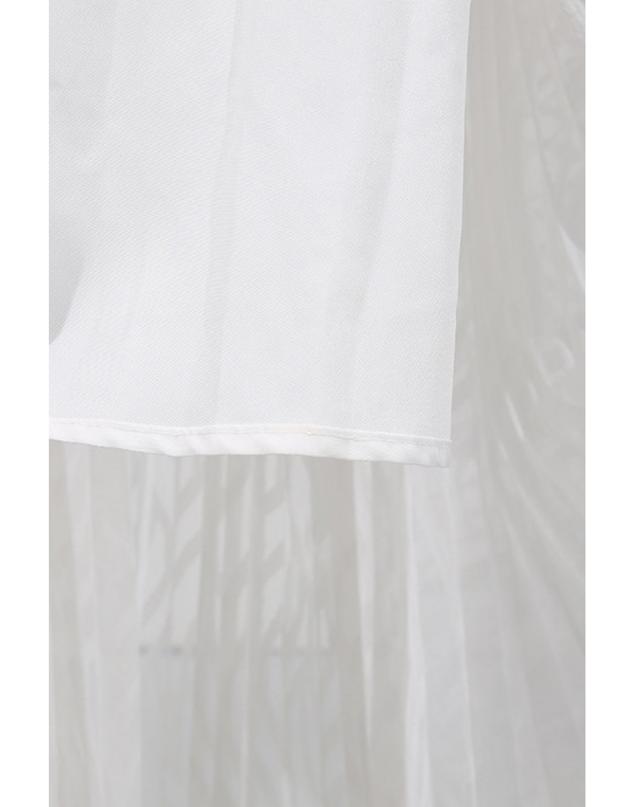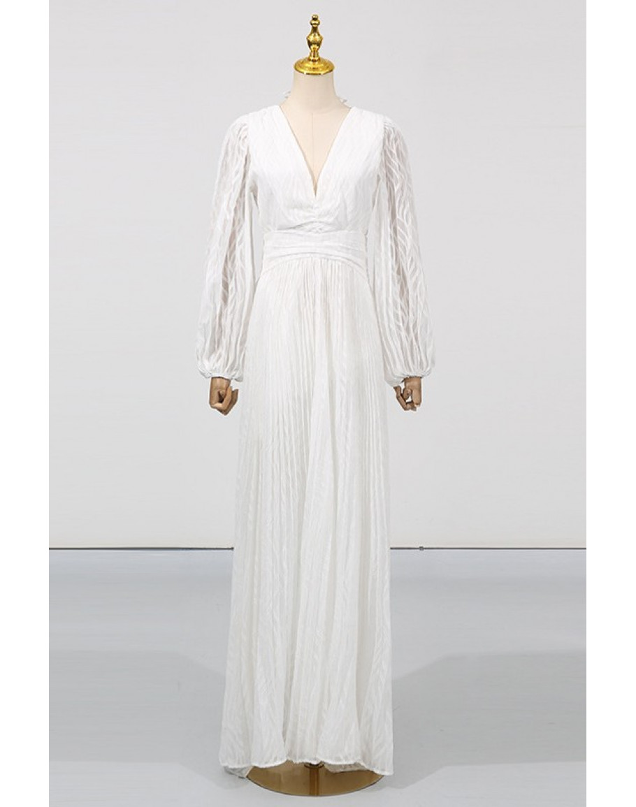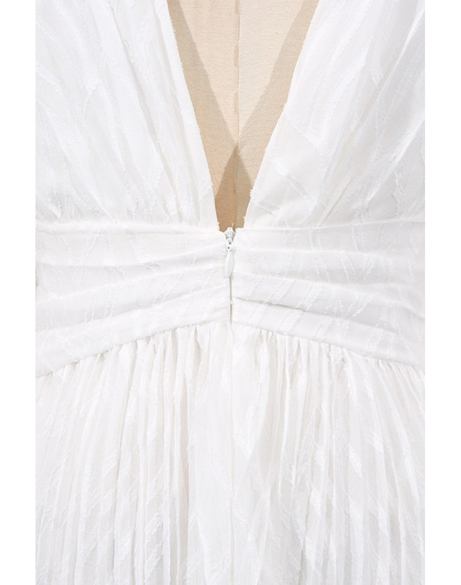 A flowing empire waist maxi dress with a deep plunge neckline and sheer sleeves. A striking choice for white party events and elegant celebration nights.