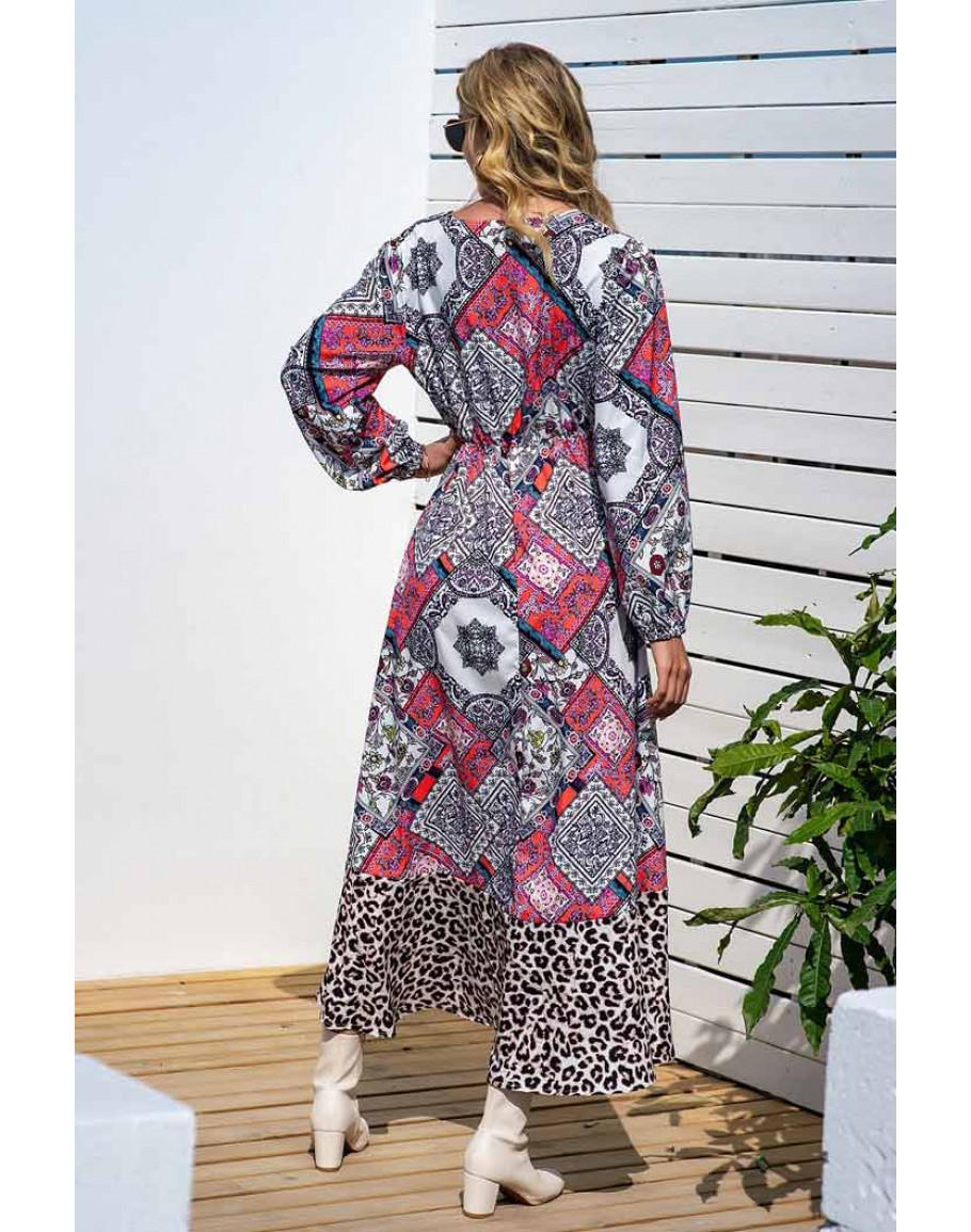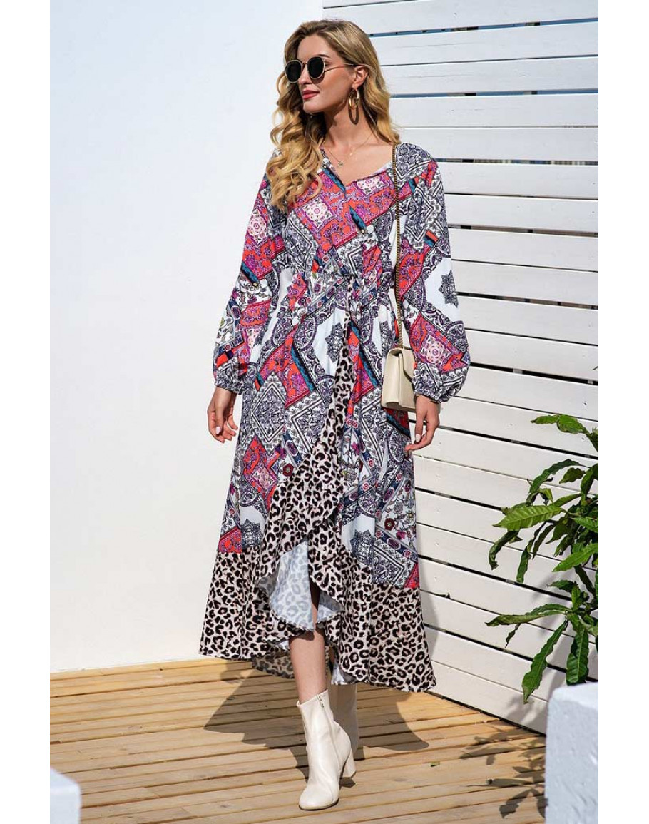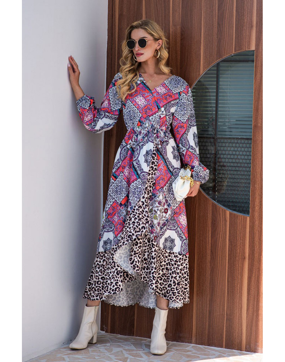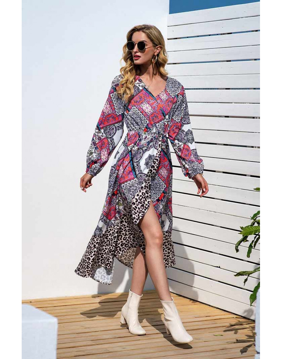 Vacation night plans call for a printed wrap midaxi dress with fluid movement. Long sleeves and a mixed pattern hem create a striking silhouette that feels elevated yet relaxed.