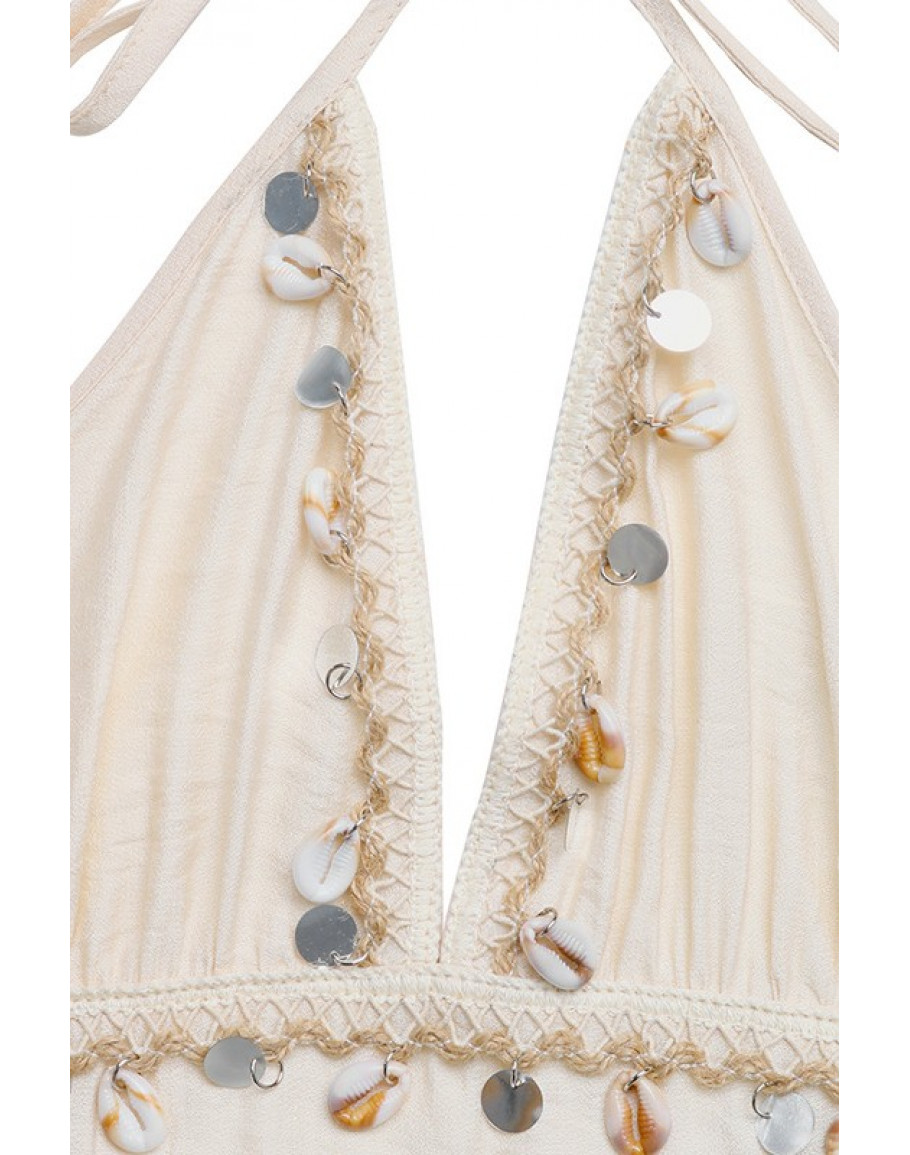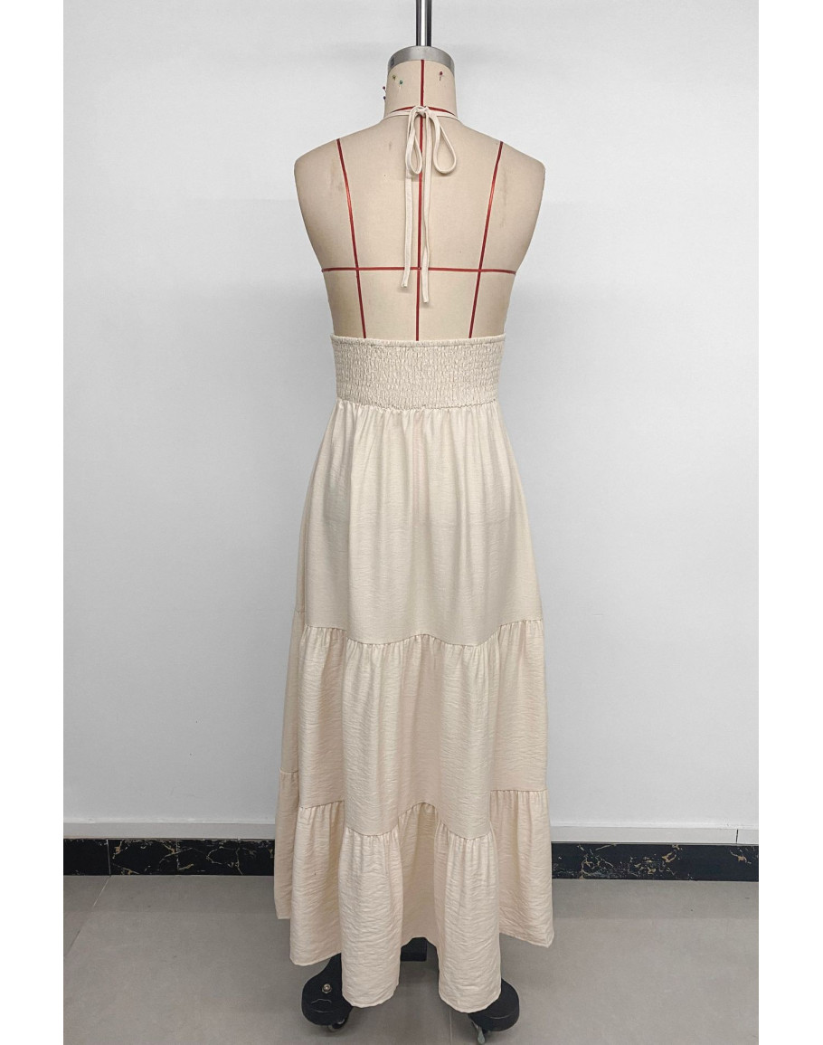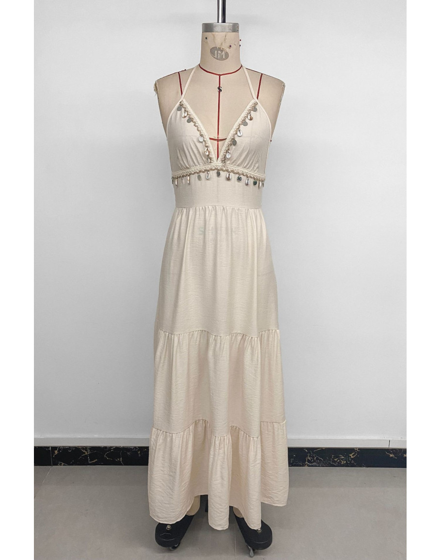 A halter maxi dress with shell-trim neckline and tiered skirt for vacation day styling. Lightweight fabric and open-back structure create an effortless resort-ready silhouette.