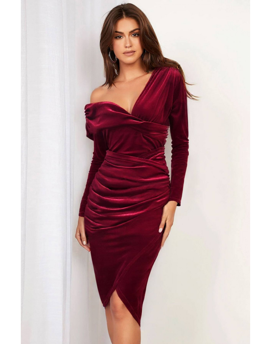 Birthday dinner plans call for a velvet one shoulder midi dress with ruched detailing. A wrapped waist and asymmetrical hem create a sculpted, confident silhouette.