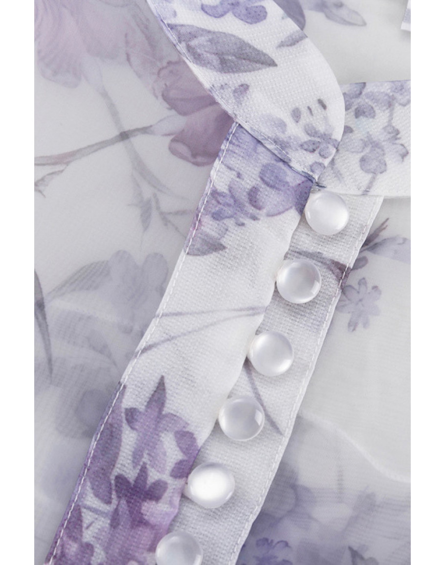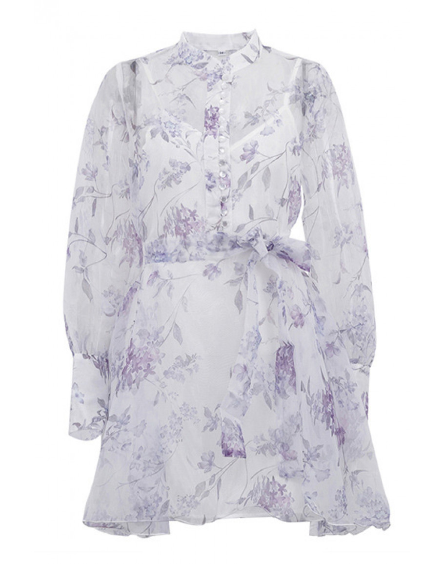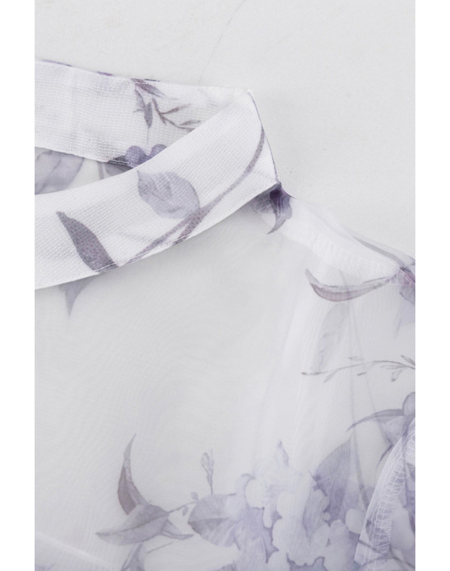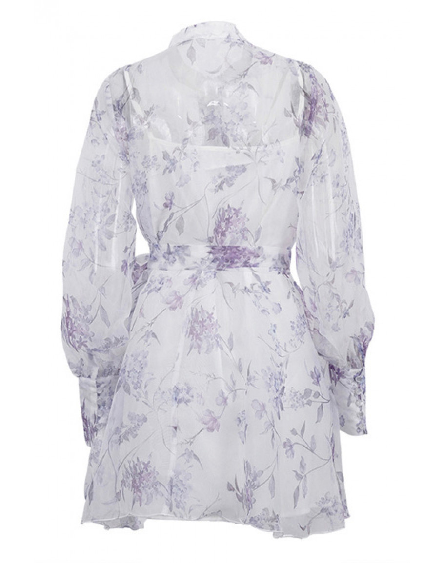 For birthday dinners and bridal events, this sheer floral mini dress features a high neckline, waist tie, and long sleeves.